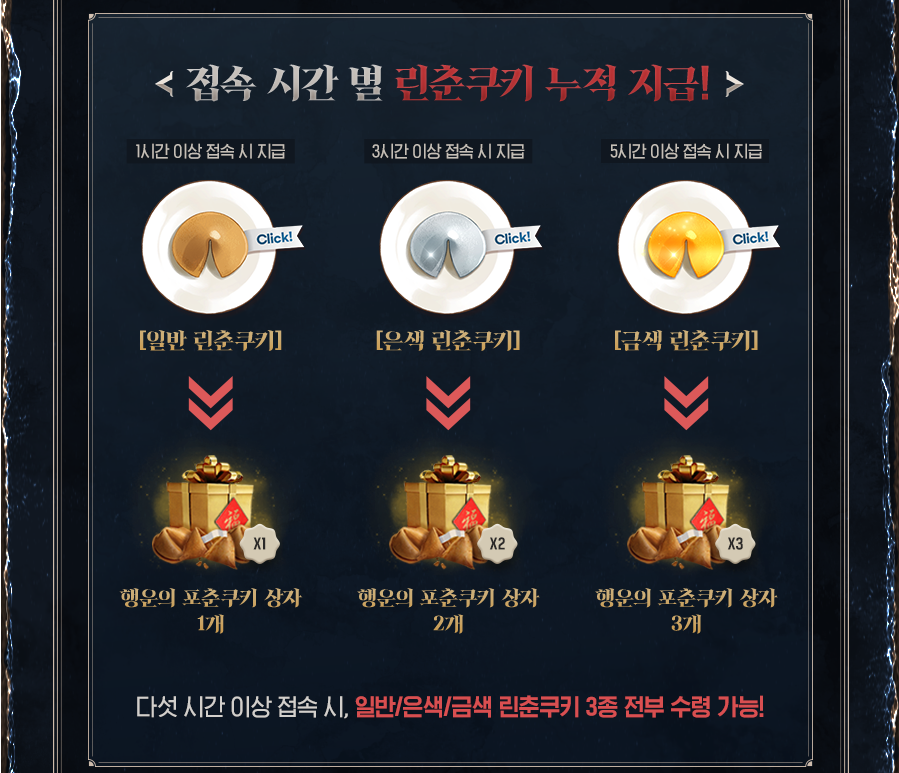 린춘 쿠키를 오픈 하면 할 수록 추가 보상이 지급됩니다. 계정당 1번에 한 하여 지급 되고, 초기화 시간은 오전 06:00 기준으로 다음 날(익일) 오전 10시에 반영됩니다.