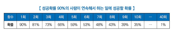 이처럼 어떤 일의 성공확률이 90%를 갖춘 사람이라고 해도 10회 연속으로 성공할 확률은 35%까지 낮아진다. 반대로 말하면, 이것은 90%의 성공확률을 가진 사람이라고 해도 10회 실시해서 그중에 적어도 1회 이상 실패할 확률이 65%라는 뜻이다. 더욱이 40회 연속으로 성공할 확률은 1% 정도밖에 되지 않기 때문에, 40회 중에 적어도 1회 이상 실패할 확률은 99%가 된다.