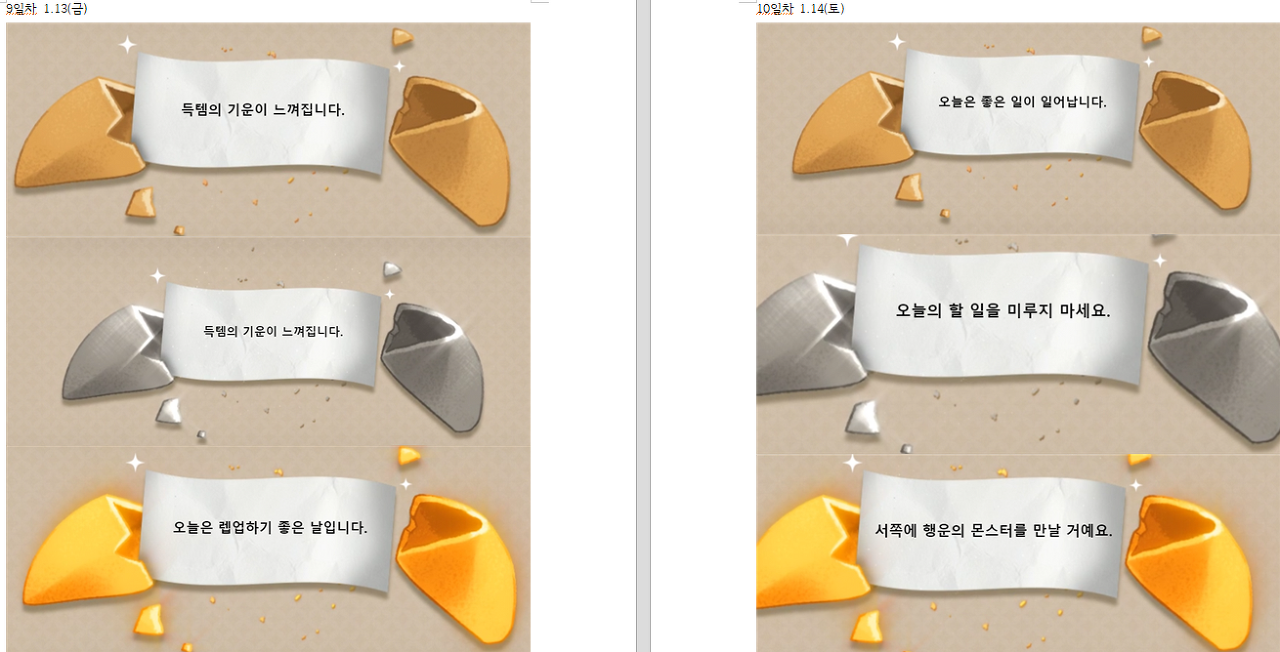 10일 정도 린춘 쿠키를 했는데요. 어떤 내용의 운새 / 점괘가 나왔는지, 혹시 제가 나오지 않은 운새 / 점괘가 있으시면 공유해주시면 좋겠습니다.