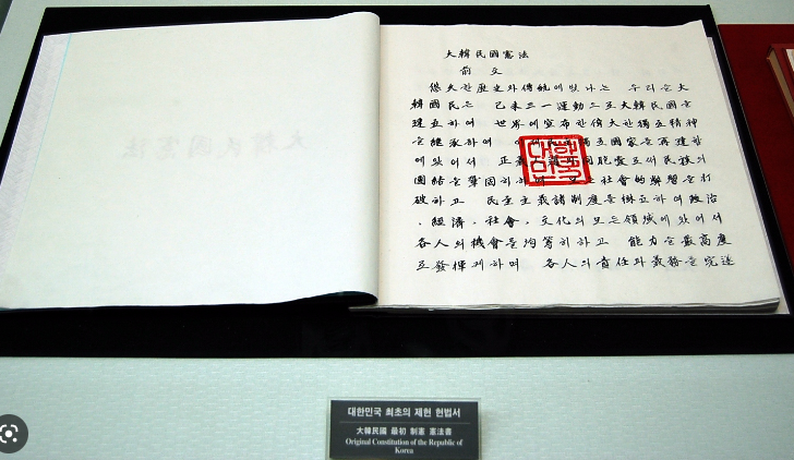 대한민국헌법 전문 "유구한 역사와 전통에 빛나는 우리 대한국민은 3ㆍ1운동으로 건립된 대한민국임시정부의 법통과 불의에 항거한 4ㆍ19민주이념을 계승하고(중략),"