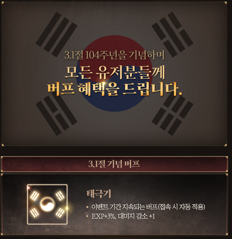 리니지 접속시 태극기 버프가 적용이 됩니다. 삼일절에 맞게 경험치 3%, 대미지 감소 +1 입니다.