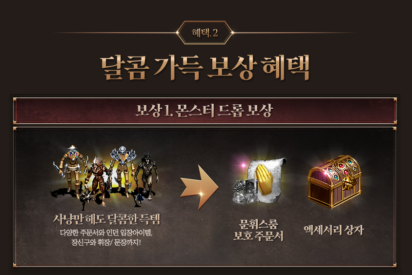 또한 이벤트 사냥터에서 사냥만 하여도 보상 획득이 가능한데요. 문휘스룸 보호주문서와 액세서리 상자를 획득할 수 있다고 합니다.