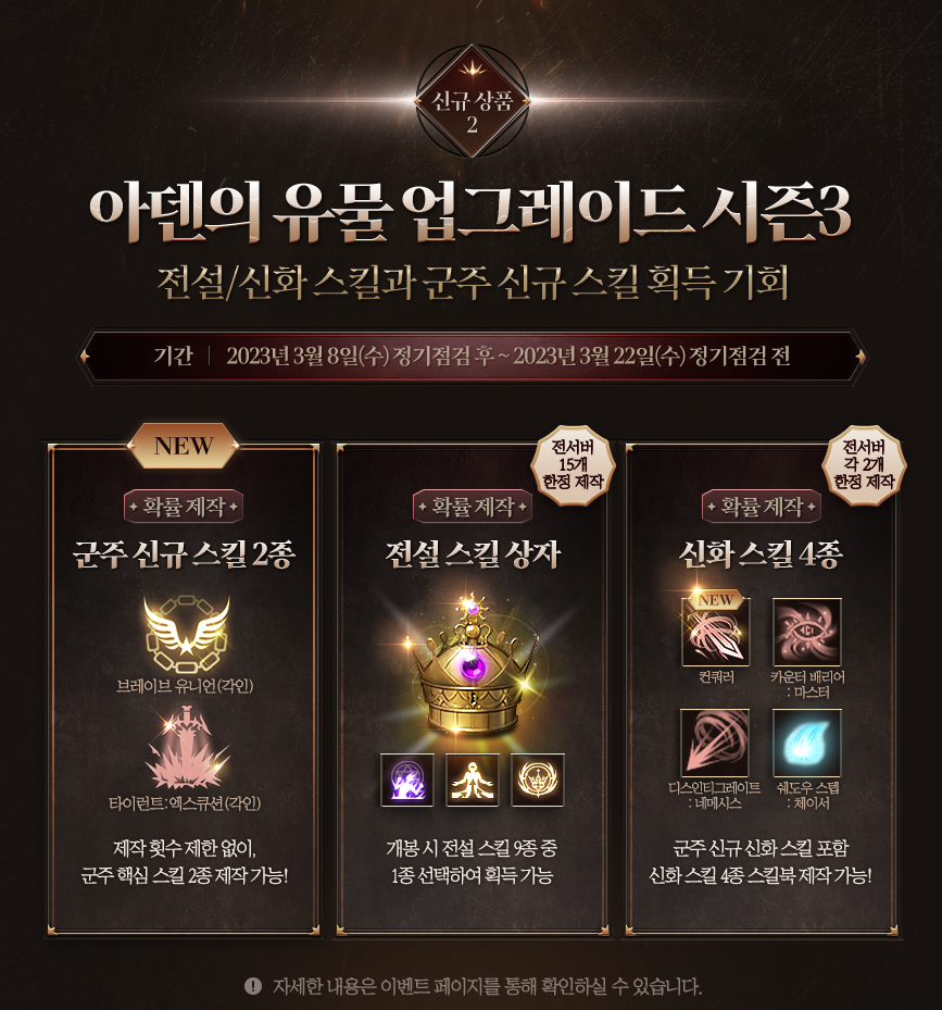 또한 전 서버 15개 한정으로 전설의 스킬 상자를 확률적으로, 또한 전서버 2개 한정으로 이번에 추가된 컨쿼러 등을 포함한 신화 스킬 4종을 확률적으로 제작이 가능합니다.