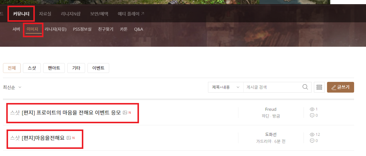 위의 두가지 방식 중에 한 가지를 선택하여 리니지 홈페이지 커뮤니티 - 이미지 게시판 - 말머리 [편지]로 등록하시면 응모가 됩니다.