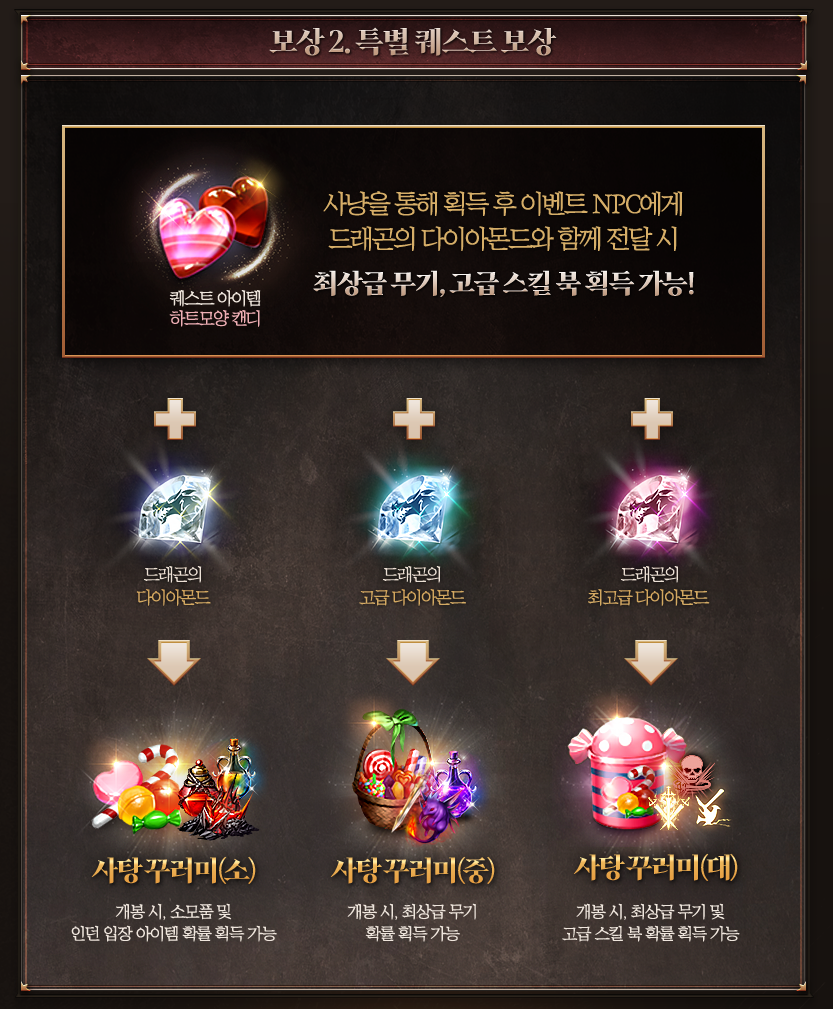 각 급 보상에 따라 사랑꾸러미(소, 중, 대)와 함께 사탕꾸러미 '중'과 '대'의 경우 확률적으로 최상급 무기 등을 추가 획득할 수 있습니다.
