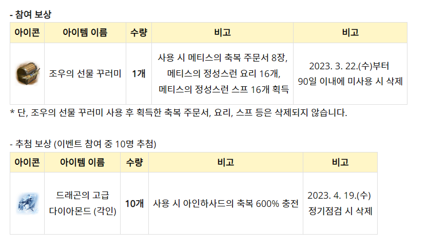 보상은 3월 22일 수요일 정기점검 때 인벤토리로 지급이 됩니다.