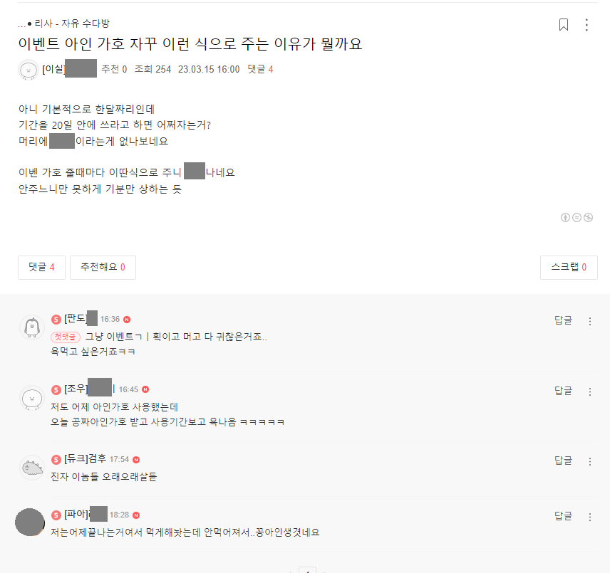 유저 카페에 보면 이번 이벤트에 대해 성토하는 내용을 볼 수 있었습니다.