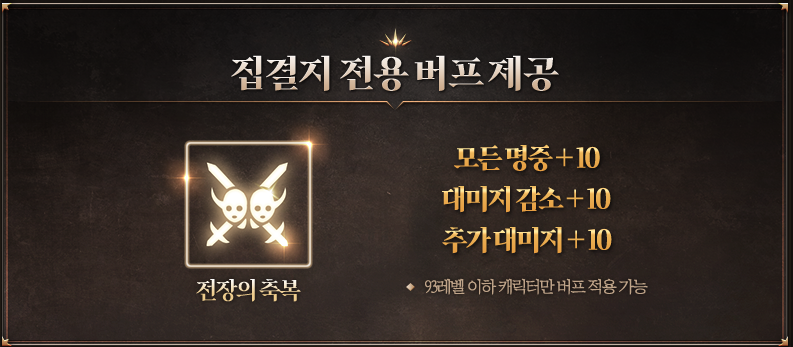 그리고 혈맹 집결지 캐릭터 입장 시 이벤트 버프가 적용되어, 명중+10, 대미지 리덕션+10, 추가 대미지+10 등이 적용됩니다.