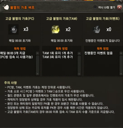 탐 1개는 1개, 탐 3개 이상인 경우 1개가 추가 되어 총 2개의 불멸의 가호가 1일 마다 적용됩니다.