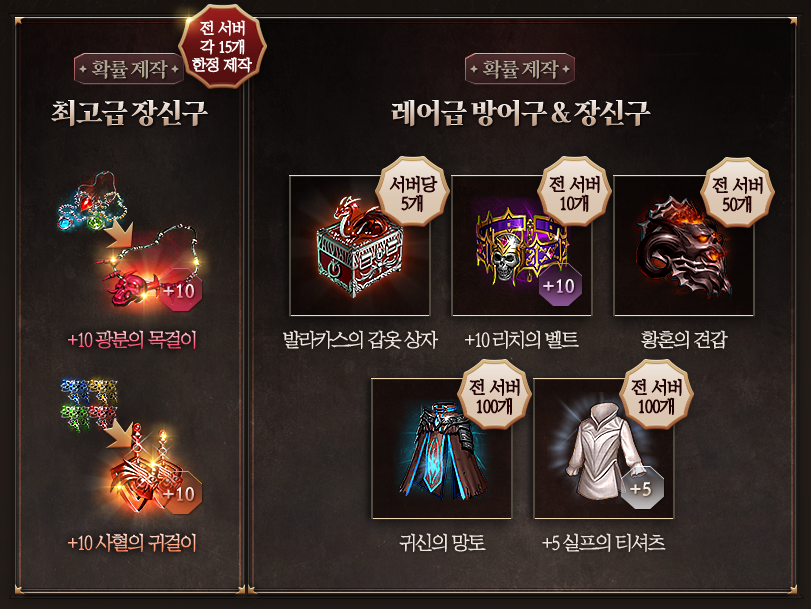 10광분목걸이, 10사혈귀걸이를 전 서버 15개 한정 제작이 가능하고, 레어급 방어구와 장신구도 이번 시즌 10에서 확률강화를 통해 제작이 가능합니다.