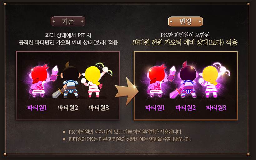 오늘 업데이트 이후 파티원 전체가 보라돌이 상태가 되어 쌍방 공격이 가능하게 됩니다.