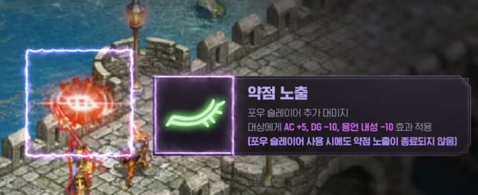 기존에는 지속 시간 16초, 포우 슬레이어 1회 사용 시 디버프 종료되었다면, 이제는 지속 시간 8초, 포우 슬레이어를 사용해도 디버프 종료되지 않도록 변경되며, 또한 AC +5, DG -10, 용언 내성 -10 효과 적용 됩니다.