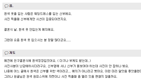사회생활에서도 장례식 장에 갈 떄는 검은 색 계열 옷을 결혼식 장에서는 신부 친구들은 흰색 옷을 입지 않는 것 입니다.