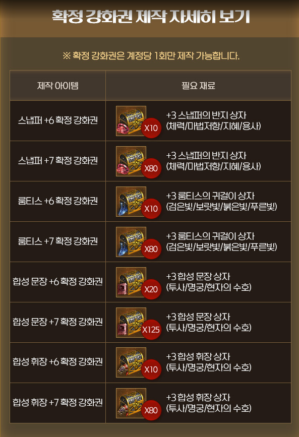 위의 표를 보면 +7확정강화권은 +3 해당 상자 80개가 필요합니다. 문장이나 휘장은 +6확정은 +3짤 중 문장은 20개, 휘장은 10개, +7확정은 문장의 경우 125개, 휘장은 80개 입니다.