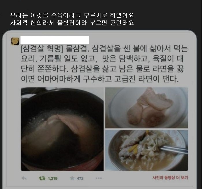 돼지고기 삼겹살을 물에 넣어 삶아 먹는 것, 물삽겹이 아닌 사회적 합의로 우리는 수육이라고 부릅니다.
