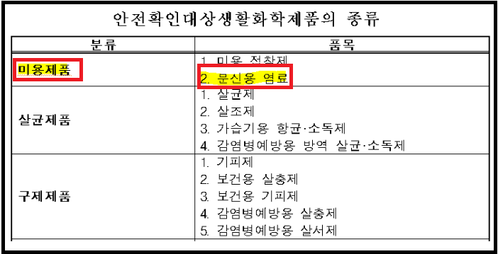 Ministry of Environment Notice No. 2022-19 (Partial Revision of January 19, 2022) According to the designation of household chemical products subject to safety confirmation and safety labeling standards, tattoo dyes are designated as the target type.