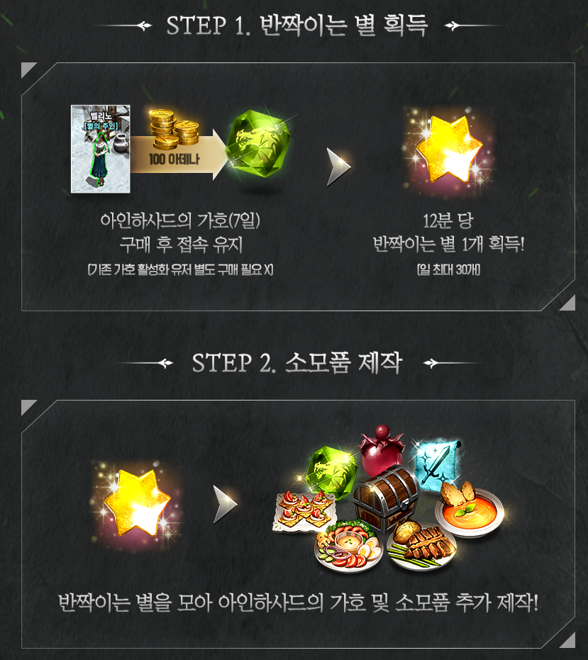 간략히 설명드리면 100아데나로 아인 가호 7일을 구매할 수 있고 12분당 1개의 별(1일 최대 30개 획득)로 가호 7일 외에 다양한 아이템을 구매할 수 있는 이벤트 입니다.