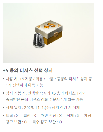 구매시 +5 용의 티셔츠 선택상자 10개를 수령하고 수, 풍, 지, 화 용티를 선택할 수 있습니다.