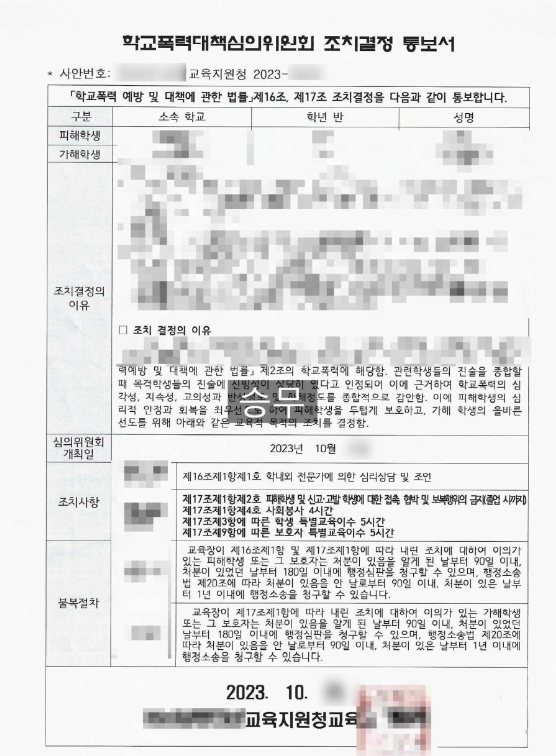 결국 가해학생은 사회봉사 4시간의 처분을 받게 되었습니다.