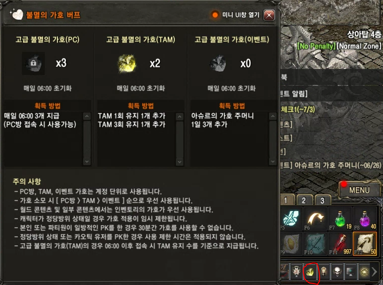 1일 1회 총 7번 개봉이 가능하고 개봉할 때마다 고급 불멸의 가호 3개를 얻을 수 있습니다.