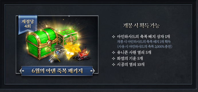 다음으로 살펴볼 업데이트는 6월 아덴 축복 패키지 유료 상품입니다. 비용은 5만원입니다.