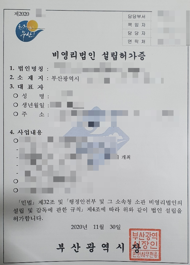 며칠 전 비영리법인 설립 업무가 마무리되었습니다. 절차는 매우 간단합니다. 정관, 총회 등 절차를 거치게 됩니다.