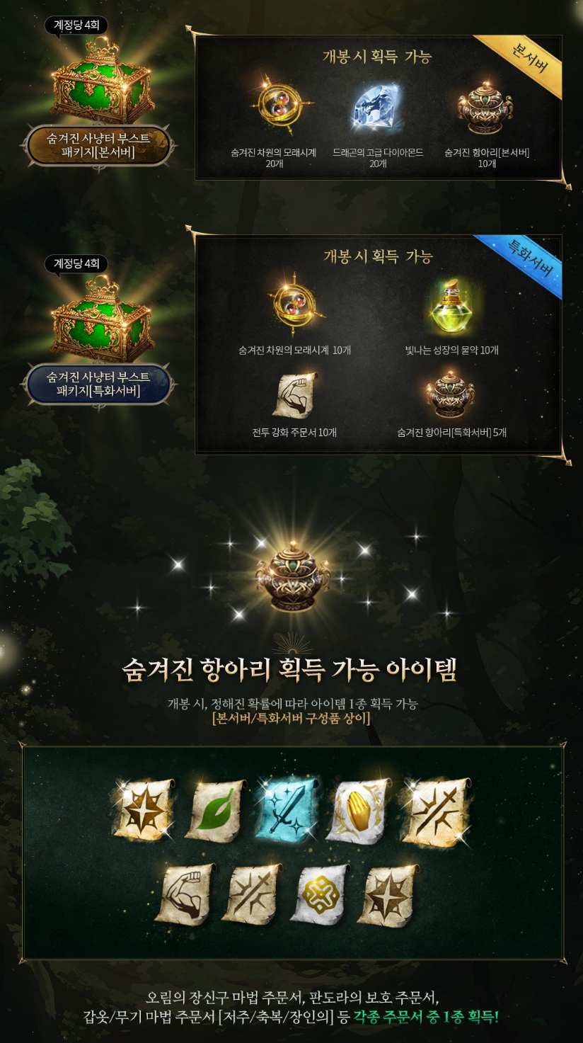 세번째는 신규 상품으로 숨겨진 사냥터 부스트 패키지 입니다. 본서버와 특화서버 모두 판매가 되는 제품으로 구성에는 다소 차이가 있습니다.