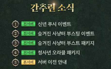 이번 업데이트는 총 5개로 신년 푸시 이벤트, 숨겨진 사냥터 부스팅 이벤트, 숨겨진 사냥터 부스트 패키지 이벤트, 청사년 오라클 패키지 이벤트 및 서버 이전 안내입니다.
