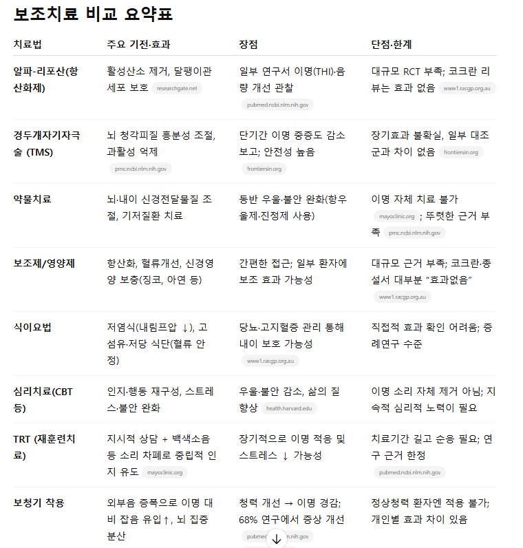 다양한 보조 치료법이 제안되었으나, 현 시점에서는 주류 과학적 근거가 확립된 만병통치약은 없다. 알파-리포산 등의 항산화제와 TMS, 보청기 등은 일부 연구에서 긍정적 결과를 보이나, 대규모 시험 및 장기 추적 연구가 부족하여 효과의 일관성은 아직 낮다. 반면 심리치료와 TRT는 이명으로 인한 불편감 감소에 일정 부분 효과를 보이며, 생활습관 개선은 안전하면서도 이명 적응에 도움이 된다. 각 방법의 이점과 한계를 환자 개별 상황에 맞춰 고려하고, 필요 시 여러 접근을 병합하는 것이 바람직하다.