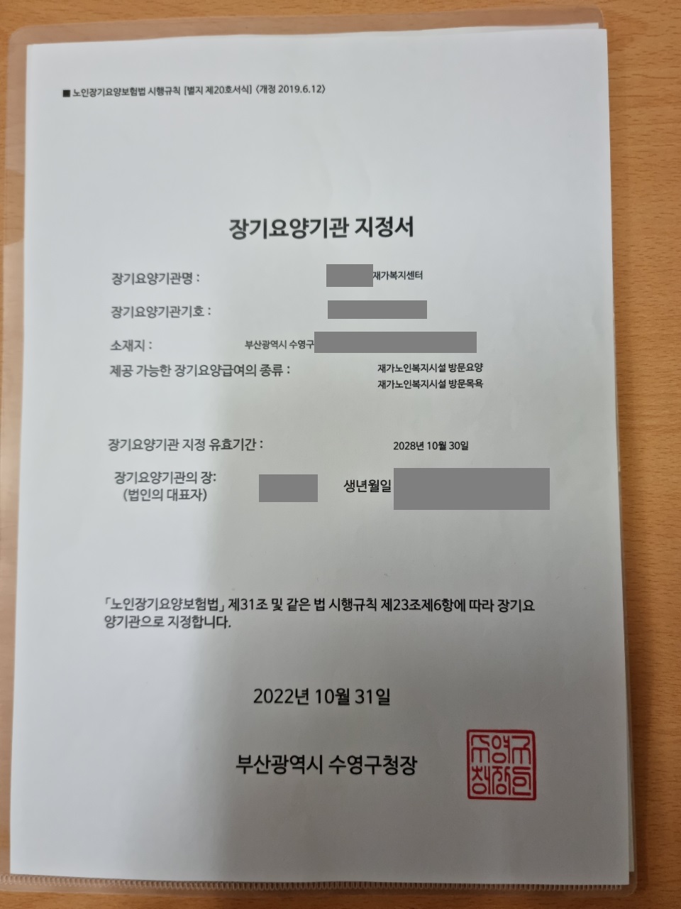 부산시 수영구 장기요양지정심사 통과 방문요양 사업계획서 제출 완료