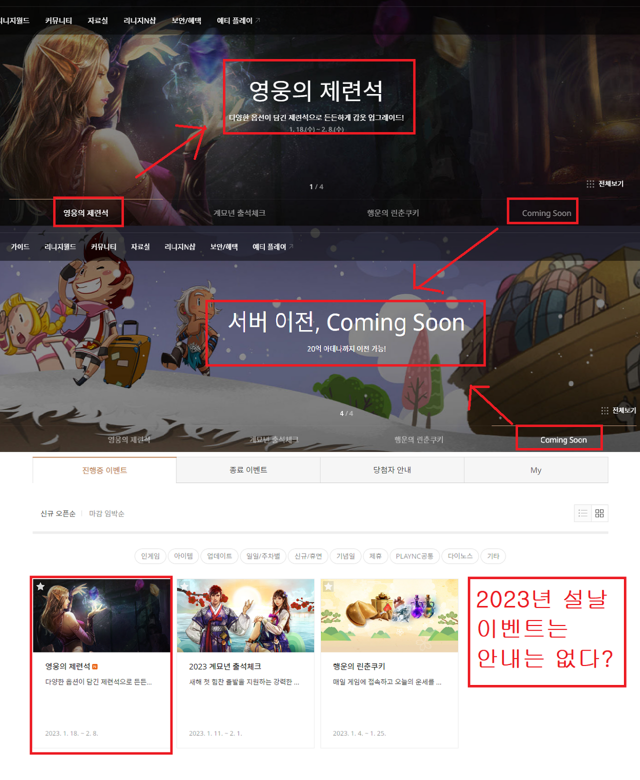 올해는 이벤트 페이지나 배너에서 찾을 수 없습니다. 과금 이벤트인 영웅의 제련석과 곧 진행될 서버이전과 캐릭터 이름변경은 메인화면 슬라이드 배너와 이벤트ON에서 아래와 같이 찾을 수 있지만 2023년 설날 이벤트에 대한 내용은 없습니다.